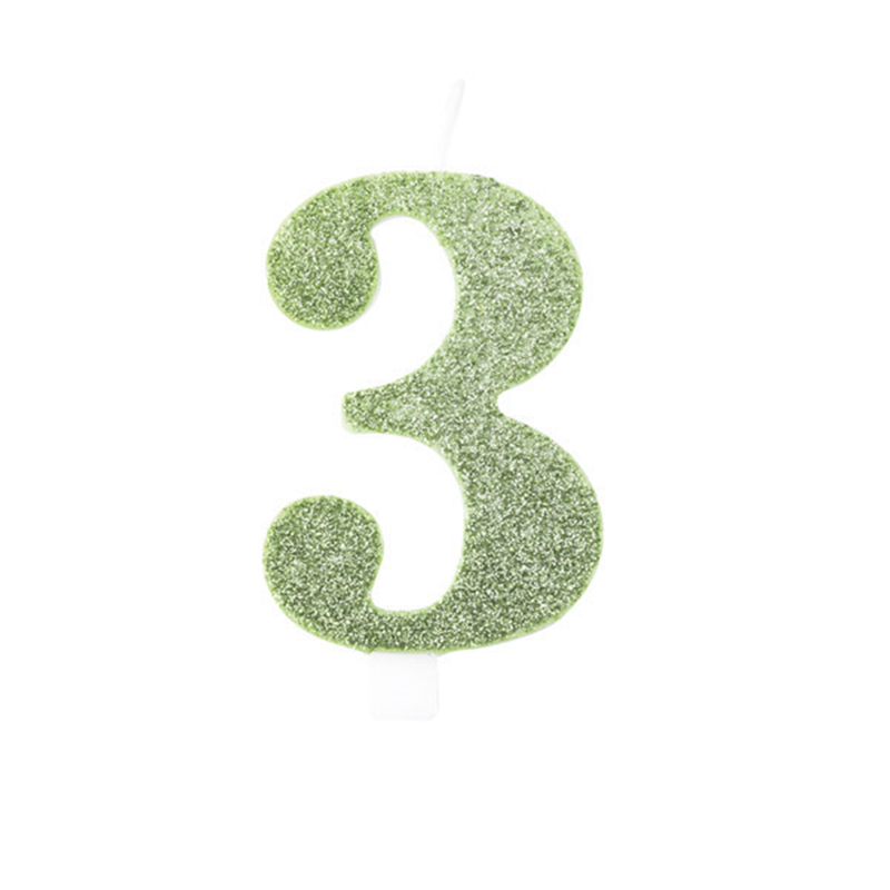NUMBER-SHAPED CAKE CANDLE, MADE WITH ORGANIC MATERIALS AND DECORATED WITH ECO-FRIENDLY GLITTER. IT SIZES 9.5 CM AND IS SAGE COLOR. PRODUCED BY GIVI ITALIA SRL, IT IS IDEAL FOR CELEBRATING BIRTHDAYS IN A SUSTAINABLE AND ELEGANT WAY.