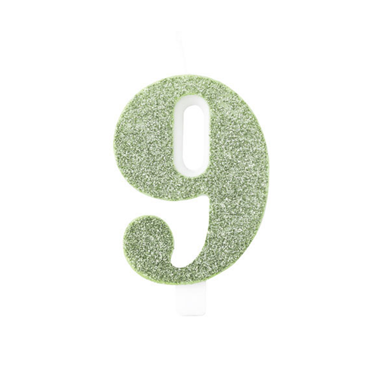 CANDLE IN THE SHAPE OF THE NUMBER "-9"- MADE WITH BIO MATERIALS AND ECOLOGICAL GLITTER, HEIGHT 9.5 CM, SAGE COLOR, PRODUCED BY GIVI ITALIA SRL, IDEAL FOR DECORATING BIRTHDAY CAKES IN A SUSTAINABLE AND ELEGANT WAY.