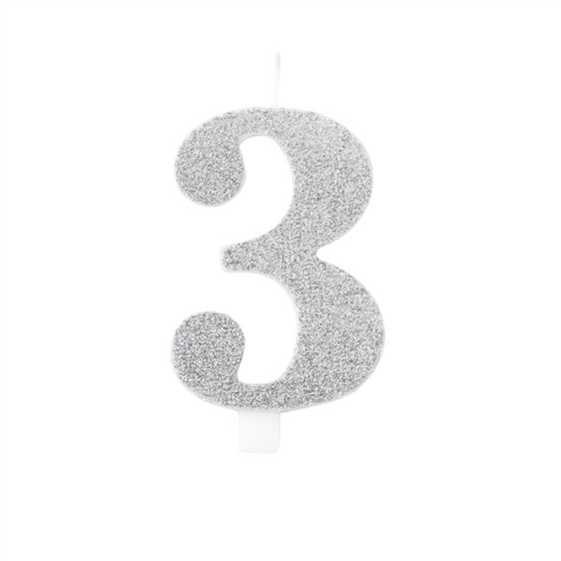 NUMBER-SHAPED CANDLE WITH A HEIGHT OF 9.5 CM, DECORATED WITH BIO SILVER GLITTER. PERFECT FOR DECORATING BIRTHDAY CAKES OR OTHER SPECIAL OCCASIONS, ADDING A TOUCH OF ELEGANCE AND BRILLIANCE. PRODUCED BY GIVI ITALIA SRL, THIS CANDLE IS MADE WITH ECO-FRIENDLY MATERIALS.