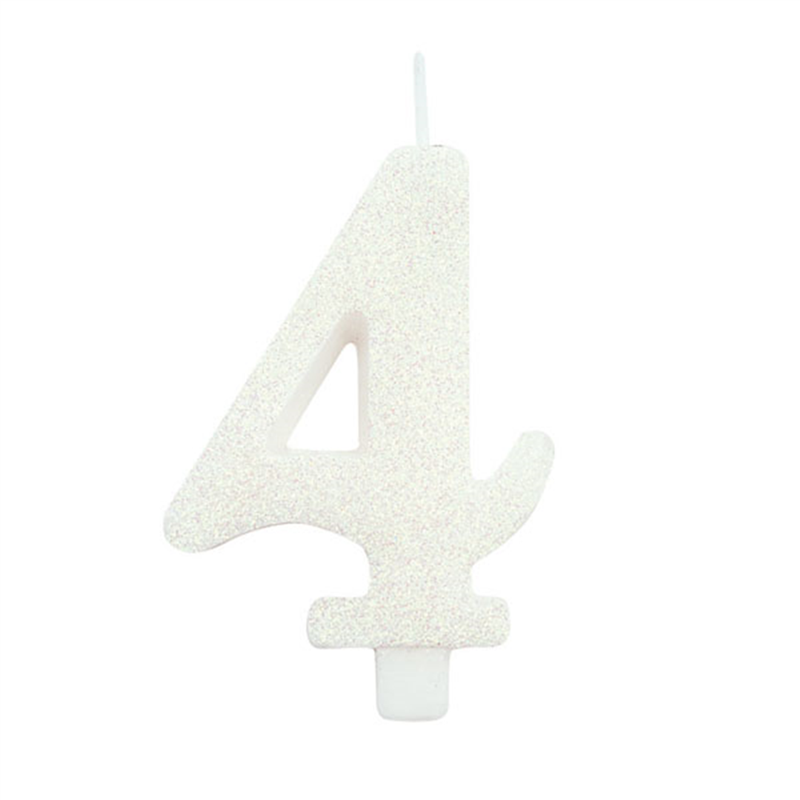 CANDLE IN THE SHAPE OF THE NUMBER "-4"- MADE OF ORGANIC MATERIAL WITH GLITTER, 9.5 CM HIGH, WHITE COLOR. PRODUCED BY GIVI ITALIA SRL, IDEAL FOR DECORATING BIRTHDAY CAKES WITH AN ECOLOGICAL AND SPARKLING TOUCH.