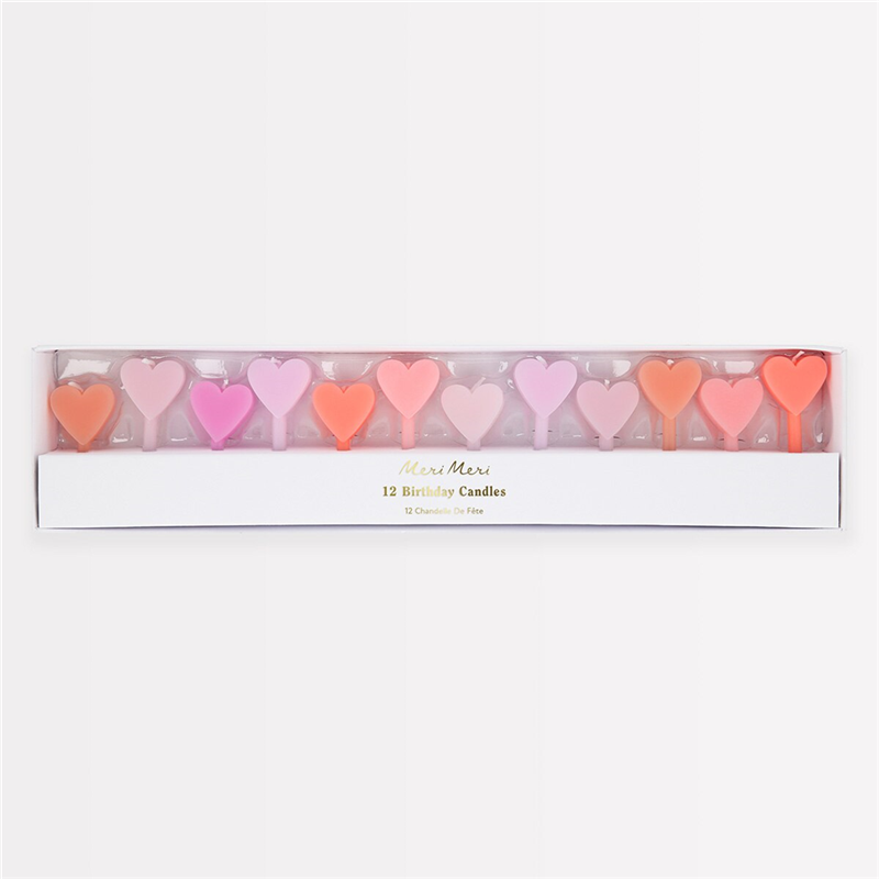 Pink Heart Candle Cake Set 12pcs Merimeri: A set of 12 pink heart-shaped candles, perfect for decorating cakes and celebrating special occasions with a touch of romance and style. Made with high-quality materials, they ensure a bright and even flame. Ideal for birthdays, anniversaries, or any event that deserves a touch of sweetness.