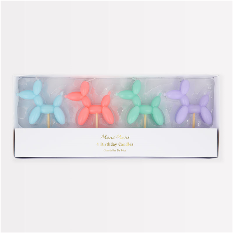 BALLOON DOG CAKE CANDLES ARE A SET OF 4, PERFECT FOR ADDING A TOUCH OF FUN AND ORIGINALITY TO ANY PARTY. EACH CANDLE IS SHAPED IN THE SHAPE OF A BALLOON DOG, MADE WITH ATTENTION TO DETAIL AND WITH BRIGHT COLORS, IDEAL FOR DECORATING BIRTHDAY CAKES OR OTHER SPECIAL OCCASIONS. THESE CANDLES ARE A UNIQUE WAY TO SURPRISE AND DELIGHT GUESTS OF ALL AGES.