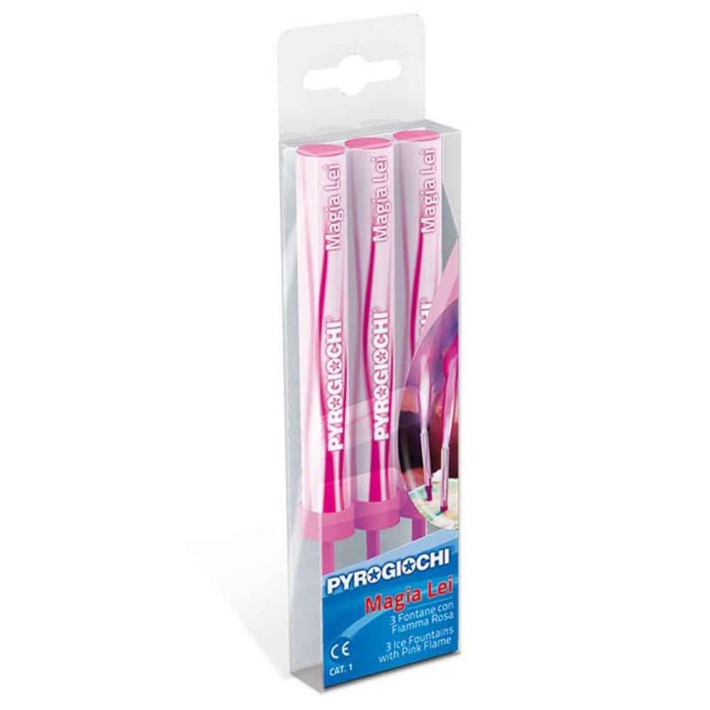 The English translation is: "The Fountain Flamb� Color 3pcs Pink by Pyrogiochi is a set of three decorative pyrotechnic fountains that emit pink sparks. Ideal for parties and celebrations, these fountains are safe for indoor use and add a touch of vibrancy and color to any special event."