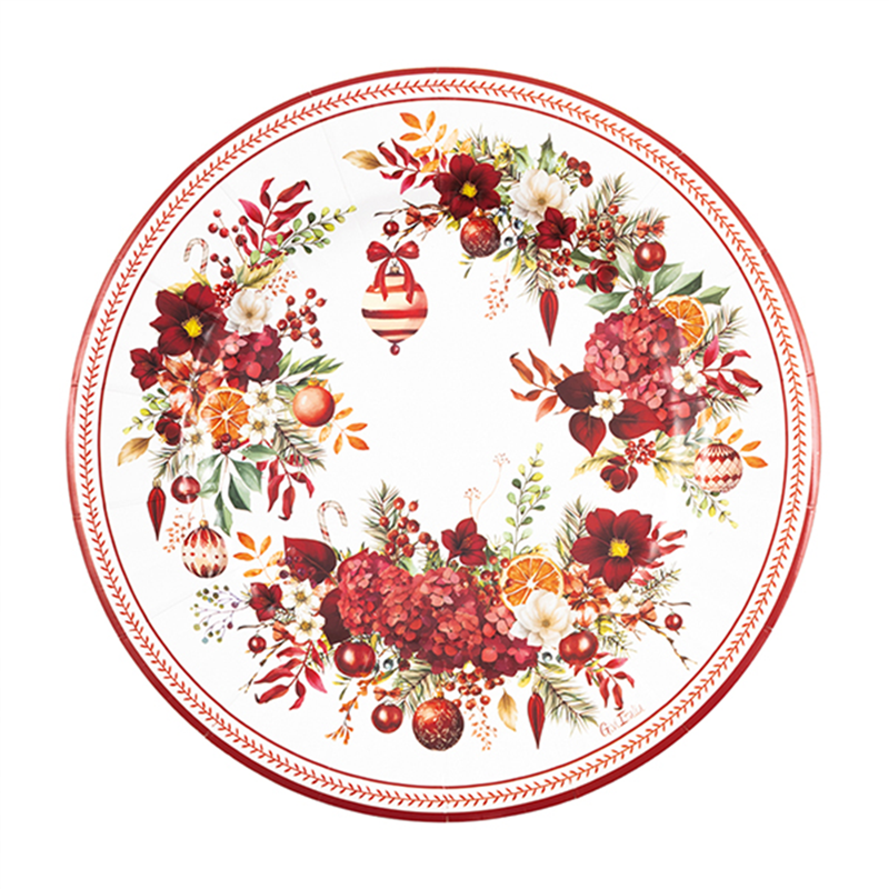 27 cm paper plate decorated with an elegant "-Christmas bouquet"- motif. The pack contains 8 pieces, perfect for adding a festive touch to your table during the holidays.
