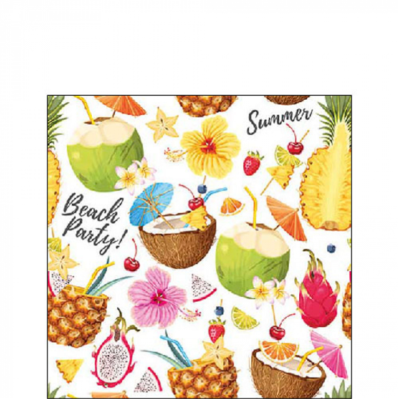 PAPER NAPKIN DECORATED WITH A FRESH AND LIVELY DESIGN, IDEAL FOR SUMMER PARTIES AND OUTDOOR GATHERINGS. WITH A DIMENSION OF 25X25 CM, IT FEATURES A "-BEACH PARTY"- THEME ON A WHITE BACKGROUND, PERFECT FOR ADDING A TOUCH OF FUN AND STYLE TO YOUR TABLE.