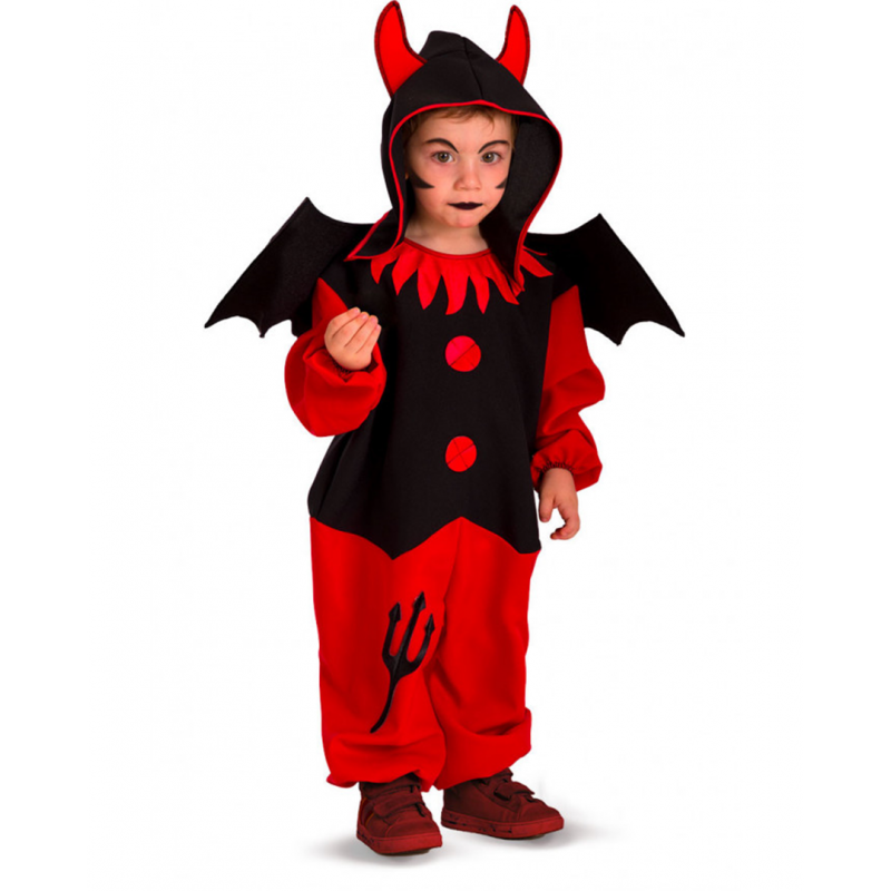 Baby Devil Costume for children aged 1/2 years, height 90 cm, made in red and black colors. Includes a comfortable and soft jumpsuit, with velvet details and shimmering finishes. Equipped with a hood with horns and a tail for a complete devilish look. Perfect for Carnival or costume parties.