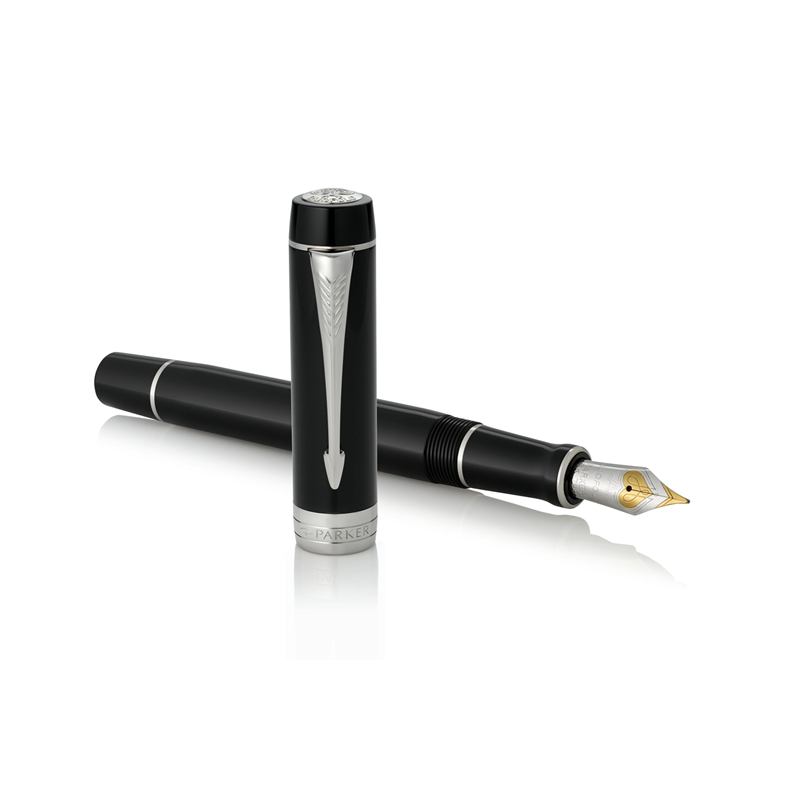 Duofold Classic Black, medium nib, emblem of the Parker tradition of high craftsmanship since 1921, centennial size fountain pen with larger barrel, cap and nib, barrel in velvety black precious resin with 23-karat gold-plated trim, two-tone nib in solid 18-karat gold, rhodium-plated, medium nib- black ink