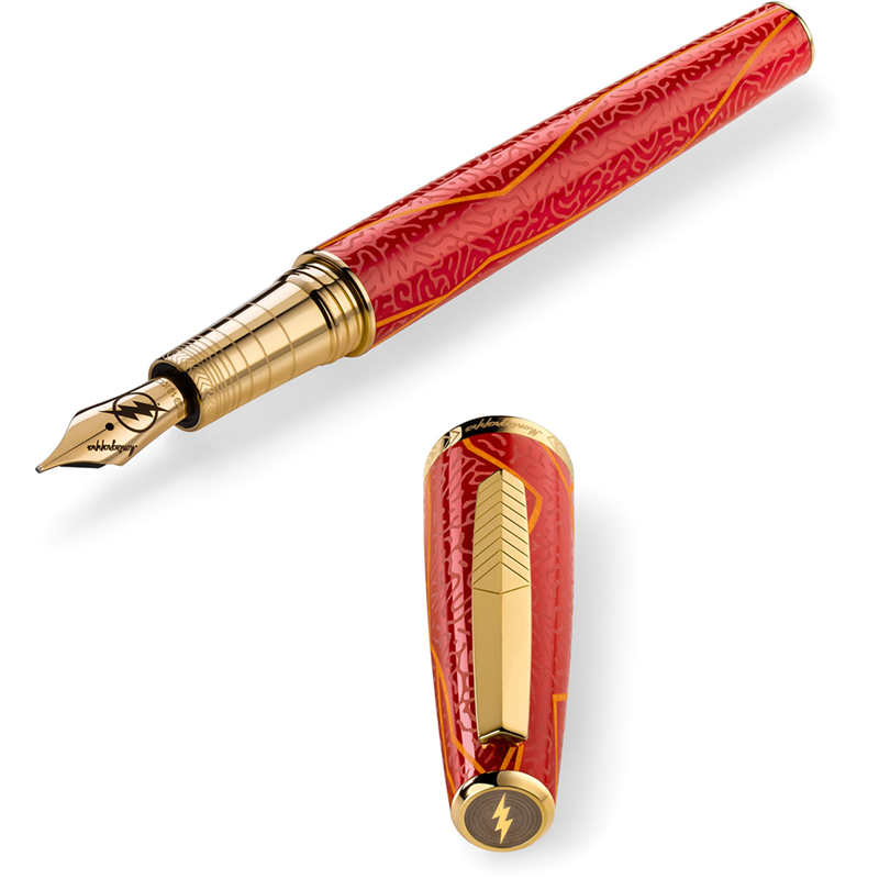 "-Our return to the DC Universe, following the tribute to The Batman (2022) in the cult series, abandons weapons to focus on super speed. The futuristic and hyper-fast design of The Flash shines in resin and precious metals. The iconic cinematic costume of the fastest man alive inspires a hyper-modern fusion of polished vermeil and intricate handcrafted finishes, aerodynamic and super sophisticated. Features: Materials: Resin Nib: 18k gold Packaging: Special Filling: Converter, cartridge Hardware: Brass, steel Accessories included: 2 cartridges Measurements: Length: 145.00 Diameter: 17.00 Weight: 38.00"-