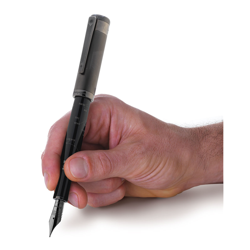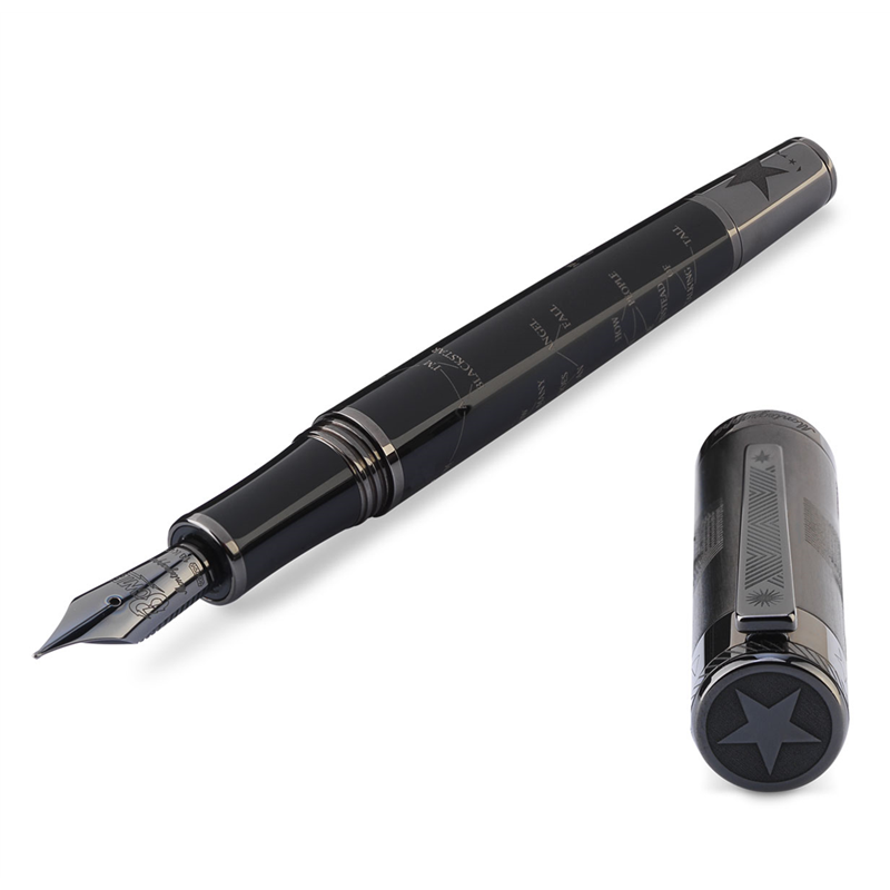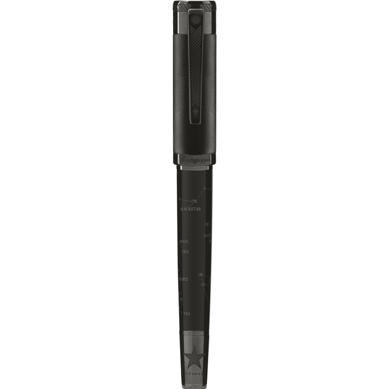 materials: resin, brass. small parts: ultra black ruthenium plated. nib: 18k gold. loading: piston. packaging: special. length: 138 mm. diameter: 15.5 mm. weight: 59.00 gr. decades at the forefront of music and visual art have made David Bowie an icon of world culture. we observed his lively career through the lens of?, also known as blackstar, his latest dramatic work. the complex ruthenium finishes and the ultra-modern style are the hallmarks of a pen that reflects the nature of bowie itself: enigmatic, meticulously produced and decidedly avant-garde.