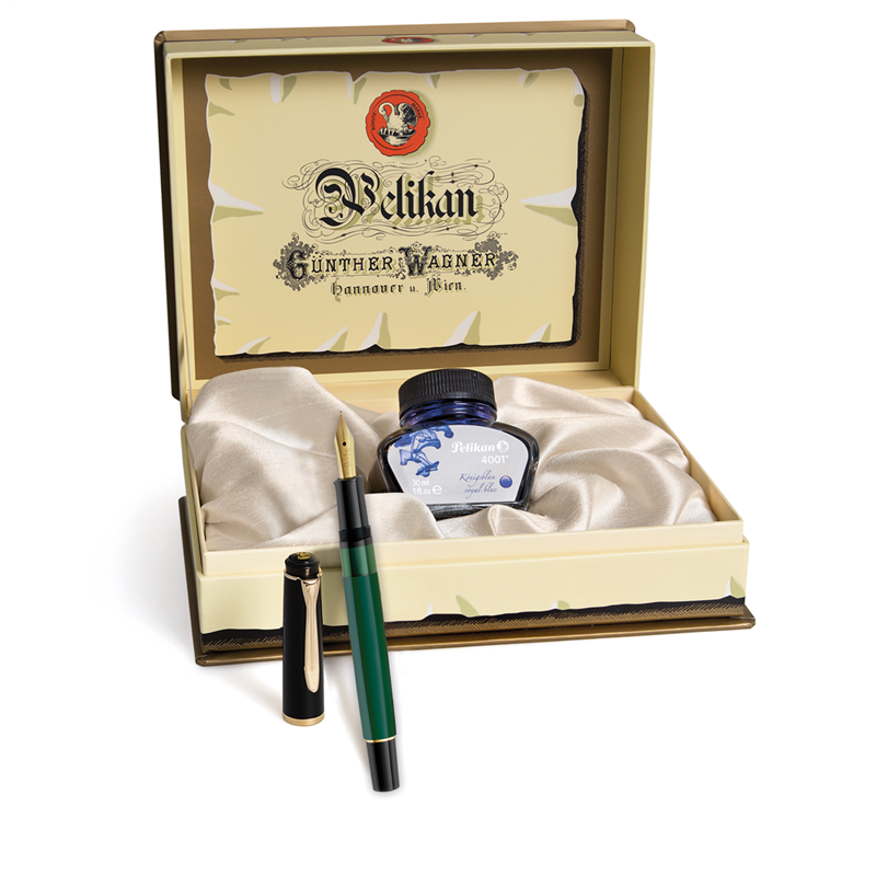the iconic green / black pelikan fountain pen is offered in size 200. the technical characteristics as well as the quality of the materials have been further improved. the filling is piston, the golden stainless steel nib, the clip in the shape of a pelican beak and the details are also gilded to give an unmistakable elegance. stainless steel nib, gilded. the green / black m251 fountain pen is presented in an exclusive nostalgia gift box with an antique and precious look, with the image of the first pelikan g�nther wagner logo from 1878 made in an original sealing wax version. the interior, lined in soft ros� champagne silk, houses a bottle of royal blue ink. measurements: 19.9 x 14.9 x 6.7 cm.