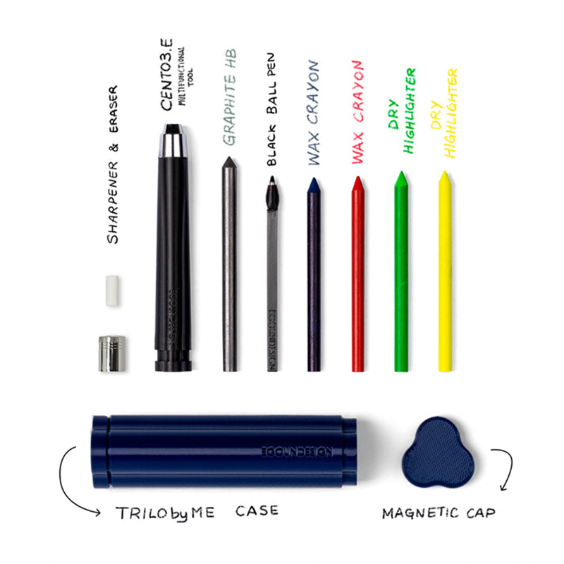 egopuntoemme portable case - egopuntoemme trilobate shape material pla magnetic caps 3d printing production made in italy, bologna includes: cento3.e multifunction tool - 1 graphite refill 1 black writing ball replacement - 2 colored wax crayons 2 highlighters - sharpener - white rubber soft touch packaging hand made