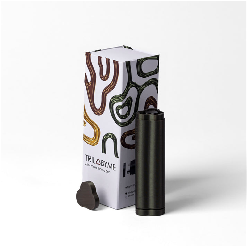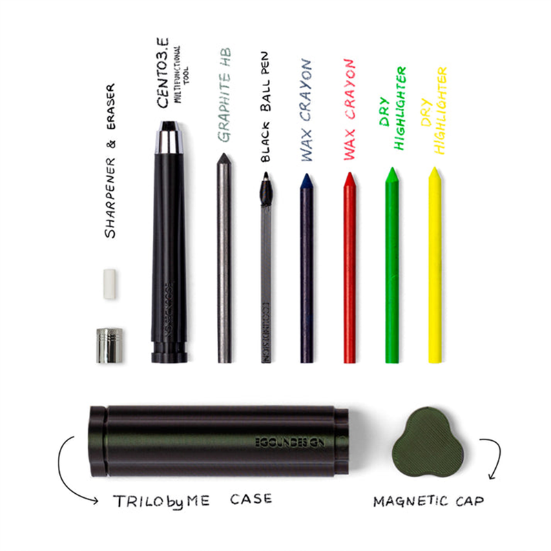 egopuntoemme portable case - egopuntoemme trilobate shape material pla magnetic caps 3d printing production made in italy, bologna includes: cento3.e multifunction tool - 1 graphite refill 1 black writing ball replacement - 2 colored wax crayons 2 highlighters - sharpener - white rubber soft touch packaging hand made