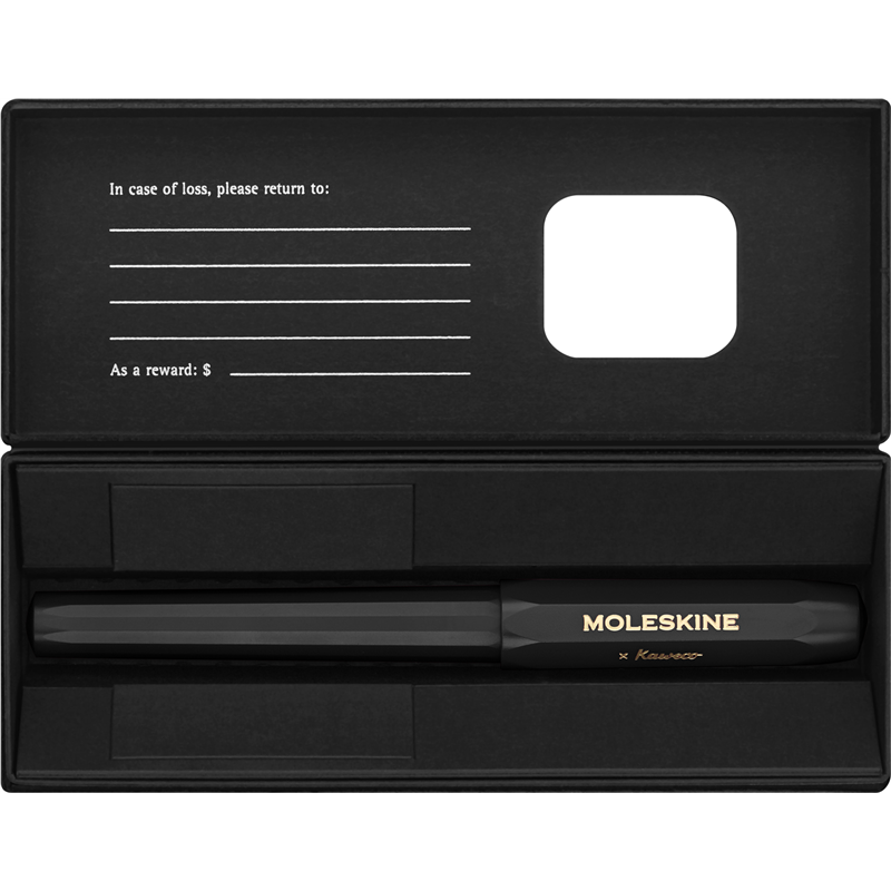 a refillable rollerball pen that harks back to a time when the future was yet to be written. moleskine x kaweco pens transport you back to this wide-open future, harking back to a time when the future was yet to be written. moleskine x kaweco pens transport you to this open future, combining nostalgia for a time you never experienced with excitement for the creative possibilities of the present. it all starts with ideas jotted down on the page with a pen that is just perfect for this exact moment. this elegant rollerball pen comes with a 0.7 mm euro black ink refill. the cardboard gift box, featuring a customizable "-in case of loss"- label, can be reused as a handy pen holder or desk organizer. choose between black, blue or red pens, each with black ink. born from a love of paper, moleskine x kaweco ballpoint pens make a unique gift for anyone who appreciates the joy of capturing ideas by hand on the page.