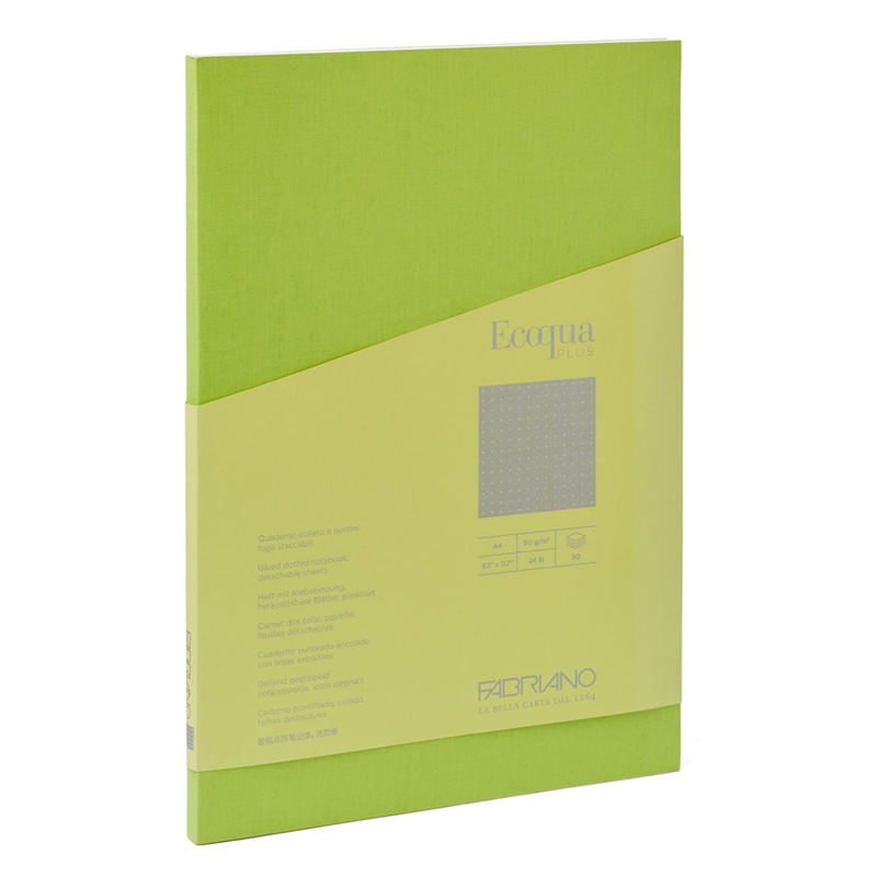 ecoqua plus glued pads with detachable sheets, 80 sheets, 2 types of interior. Internal paper ideal for any type of writing, bioprimabook 90 g/m2, with a relaxing ivory tone. The cover is made of sirio denim paper with a scratch-resistant surface finish, mass-coloured in 8 different colours. The back cover is reinforced with a sub-block to allow easy writing until the last page. External band matching the cover with the product description.
