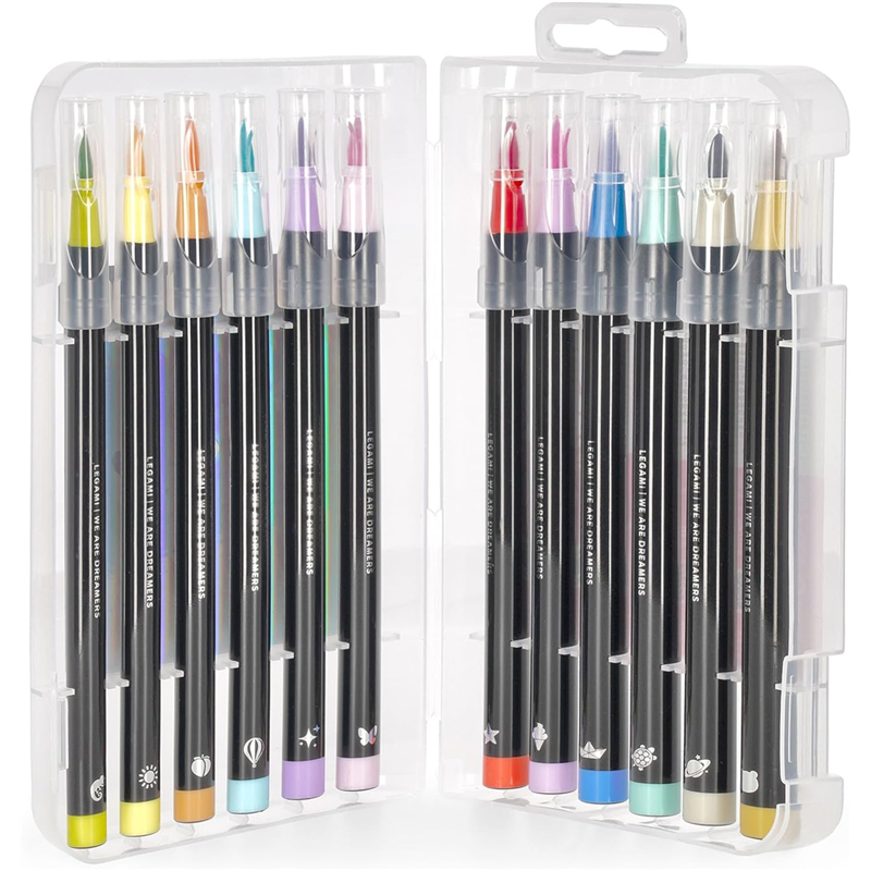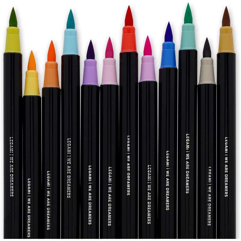 so many styles to try, so little space in the pencil case- Solve the dilemma with brush markers, the set of 12 markers with brush tips in the pastel version by Lega.