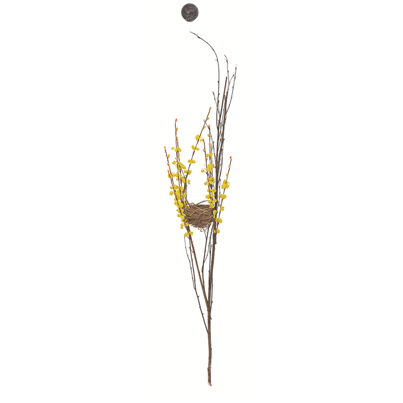 Ramo decorativo di 70 cm con un nido intrecciato e delicati fiorellini gialli, ideale per aggiungere un tocco primaverile e naturale alla tua casa. Perfetto per composizioni floreali o come elemento singolo per decorare vasi e ambienti. Questa creazione della Selezione Vertecchi combina l'eleganza dei fiori con la rusticit� del nido, offrendo un aspetto fresco e accogliente.