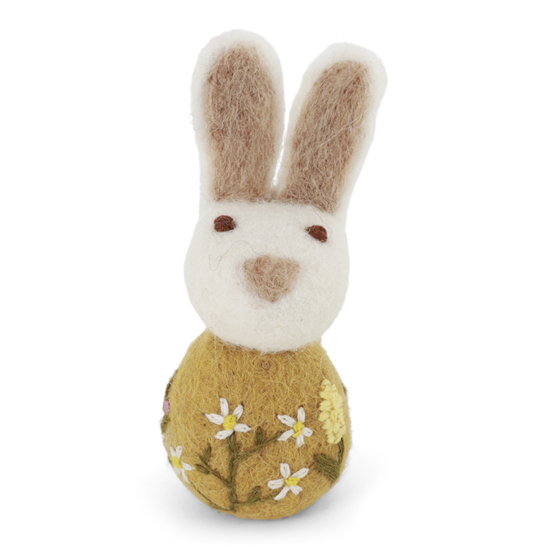 Ornamento in lana a forma di mini coniglio, decorato con fiori. Altezza di 8,5 cm e diametro di 0,7 cm. Colore ocra. Disponibile nella selezione Vertecchi.