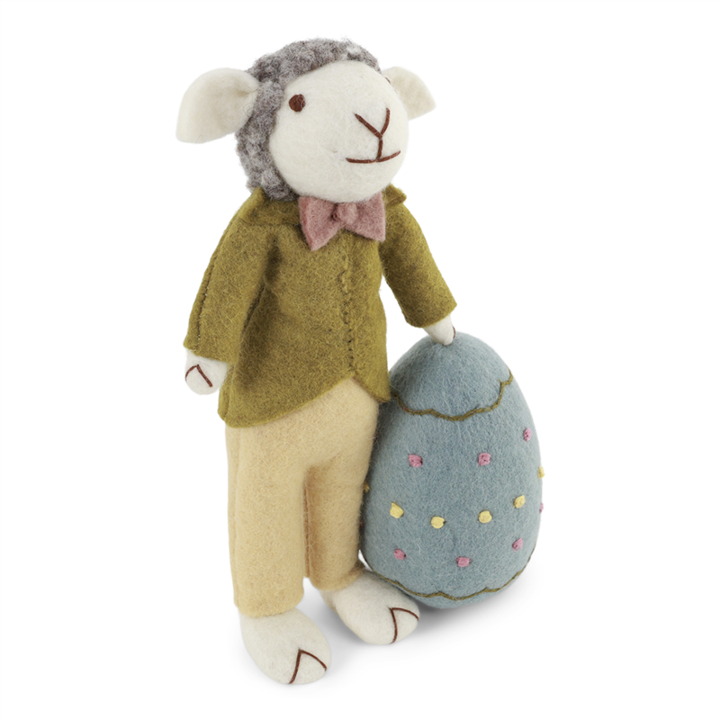 Pecora decorativa in morbida lana, alta 27 cm, con giacca verde e un uovo, parte della Selezione Vertecchi.