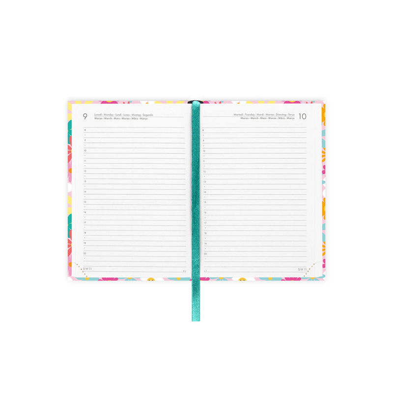 Agenda compatta 16 mesi, formato piccolo, con copertina decorata con motivo a margherite. Include spazio per annotazioni giornaliere, ideale per pianificare e organizzare appuntamenti e impegni dal 2025 al 2026. Design elegante e pratico, perfetto per l'uso quotidiano.