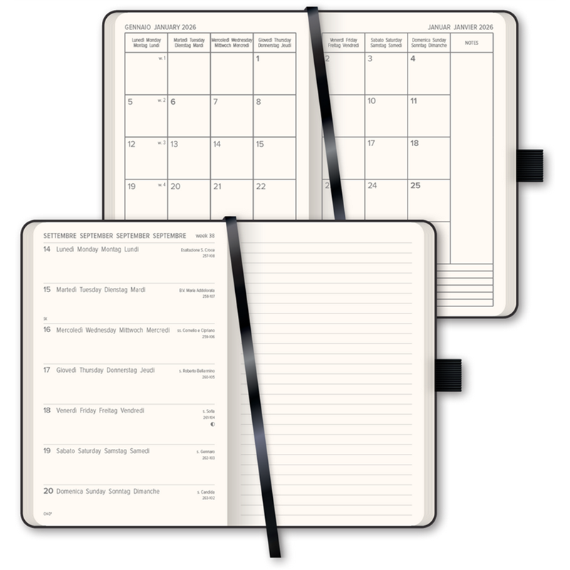 c54 settimanale, 9x14, settimanale + note, 4 lingue: i-gb-d-f, carta natural 80 gr. fsc®, 160 pagine, stampa ad un colore, segnalibro in raso, tasca sul risguardo posteriore