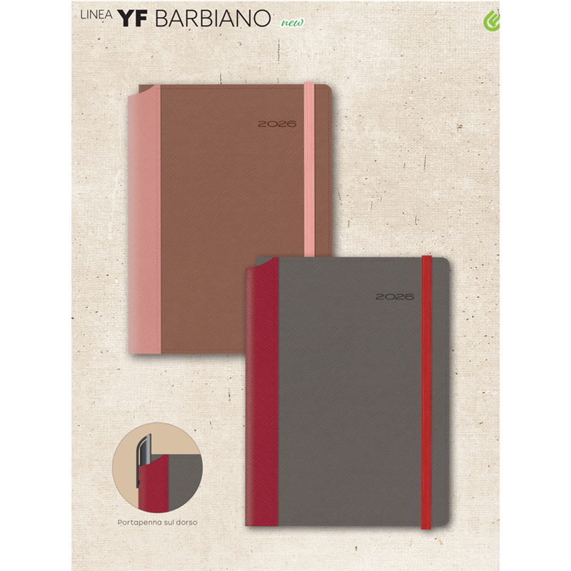 Agenda giornaliera Barbiano con dimensioni 14,5x20,5 cm, nei colori nocciola e rosa, prodotta da Cangini Filippi. Presenta una copertina elegante e resistente, ideale per l'uso quotidiano, con pagine ben organizzate per annotare appuntamenti e impegni giornalieri.