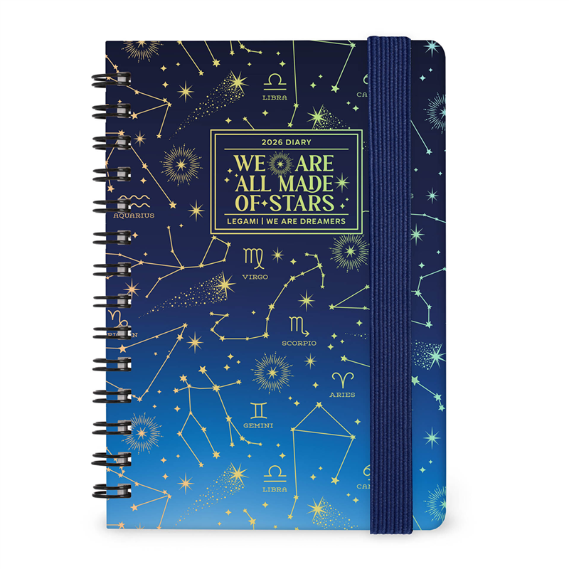 Agenda settimanale spiralata di piccole dimensioni per l'anno 2026, design "Bo Stars" di Legami. Presenta una copertina decorata con stelle e offre una visione chiara e organizzata degli impegni settimanali su 12 mesi.