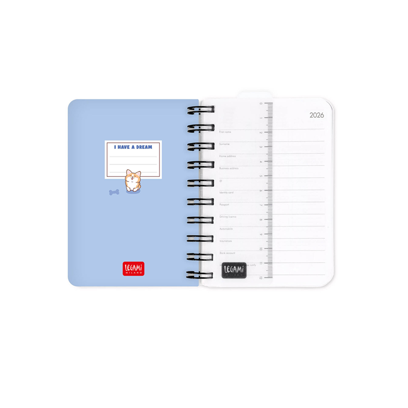 Agenda giornaliera 12 mesi, formato piccolo e spiralata, con copertina dai toni blu e design Corgi. Anno 2026, marchio Legami.
