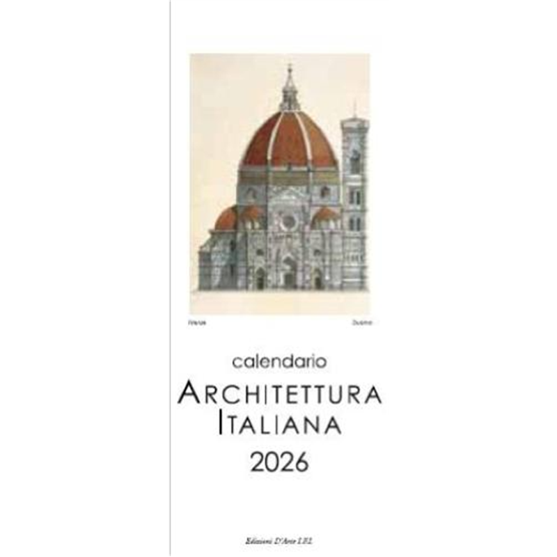 calendario artistico 2026 su carta avorio, dimensioni 13,5x34 cm, dedicato all'architettura italiana. ogni mese presenta splendide illustrazioni di edifici iconici, catturando l'essenza del design e della storia architettonica italiana. prodotto da macart s.r.l., � un elegante complemento per la casa o l'ufficio, perfetto per gli appassionati di architettura e arte.