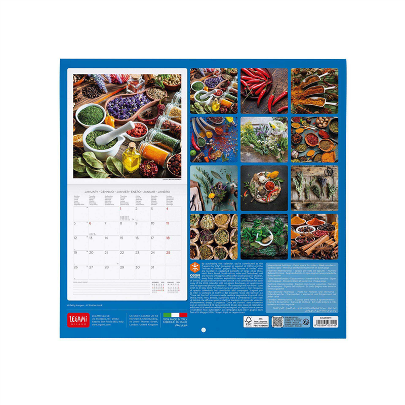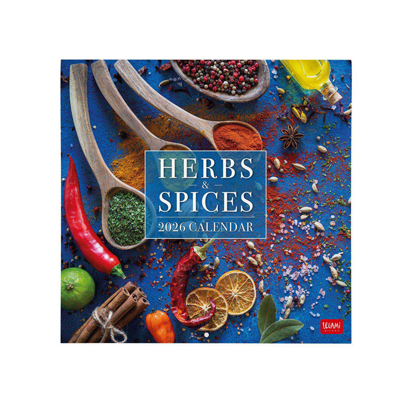 Calendario da parete 30x29 cm per l'anno 2026 con tema "Herbs & Spices", prodotto da Legami. Presenta fotografie di erbe e spezie, offrendo un tocco di freschezza e aromaticità ogni mese. Perfetto per chi ama la cucina e il mondo naturale, il calendario unisce funzionalità e bellezza visiva.