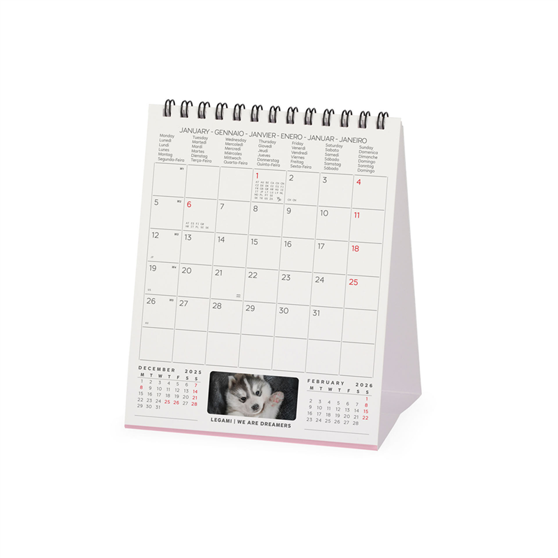 Calendario da tavolo 12x14,5 cm con adorabili fotografie di cuccioli per ogni mese del 2026. Ogni immagine cattura la dolcezza e la vivacità dei cuccioli, rendendo ogni giorno speciale. Perfetto per gli amanti degli animali, questo calendario unisce funzionalità e bellezza, aiutandoti a pianificare l'anno mentre ti regala un sorriso quotidiano. Prodotto da Legami, sinonimo di qualità e stile.