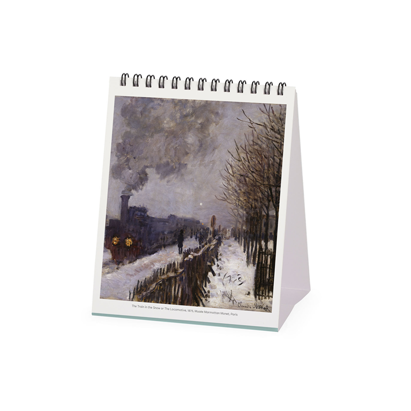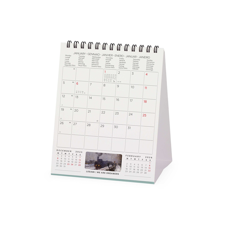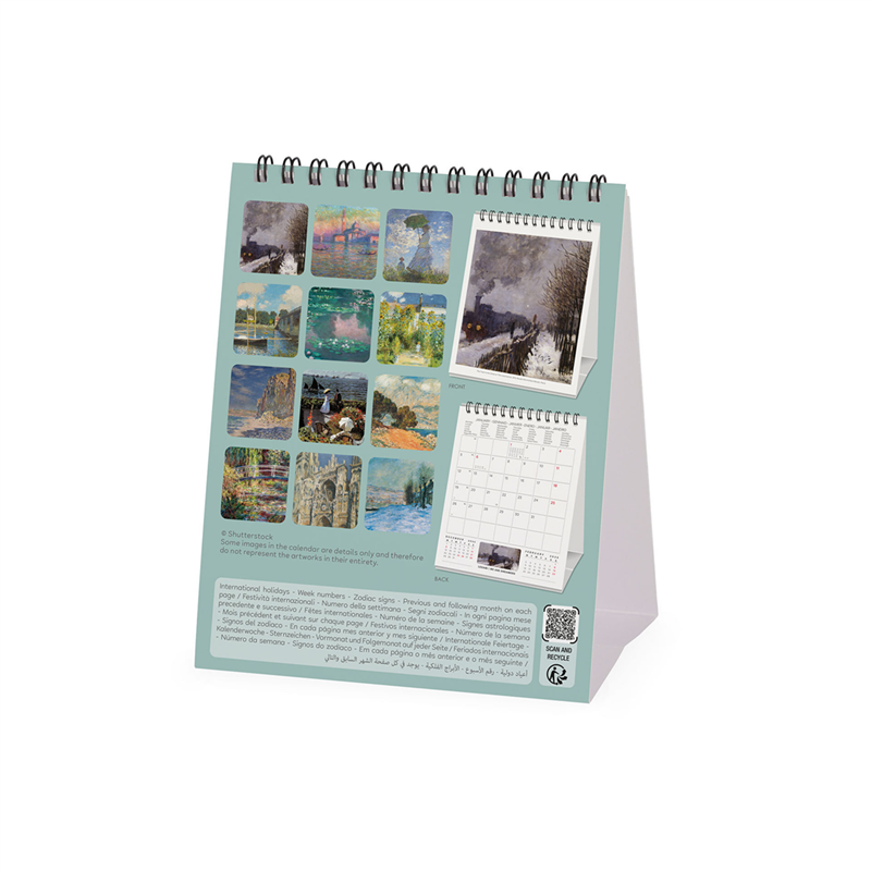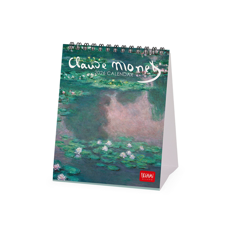 Calendario da tavolo 12x14,5 cm per il 2026, caratterizzato da una selezione di fotografie delle opere di Claude Monet. Presenta un design elegante e funzionale, ideale per l'uso in ufficio o a casa. Ogni mese è illustrato con un'opera diversa, offrendo un viaggio visivo attraverso l'arte impressionista di Monet. Prodotto da Legami, è perfetto per gli amanti dell'arte e della pianificazione.