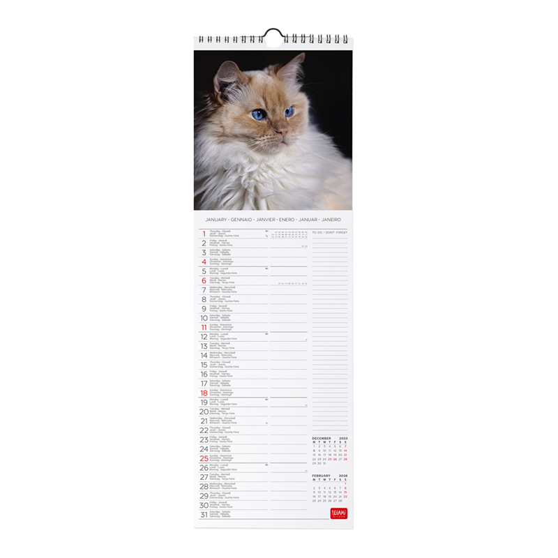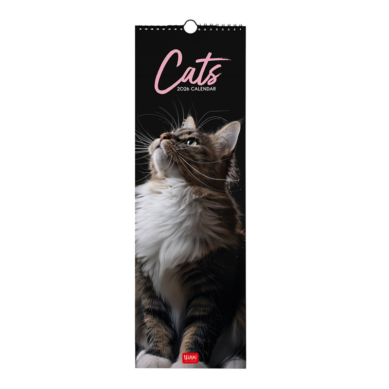 Calendario da Parete 16x49 Fotografico Cats 2026 di Legami: un viaggio attraverso l'anno con affascinanti immagini di gatti. Perfetto per gli amanti dei felini, questo calendario offre una fotografia unica per ogni mese, catturando la bellezza e il carattere dei gatti. Realizzato con materiali di alta qualità, è ideale per decorare la tua casa o il tuo ufficio, aggiungendo un tocco di eleganza e simpatia. Organizza il tuo anno con stile e lasciati ispirare dai nostri amici a quattro zampe.