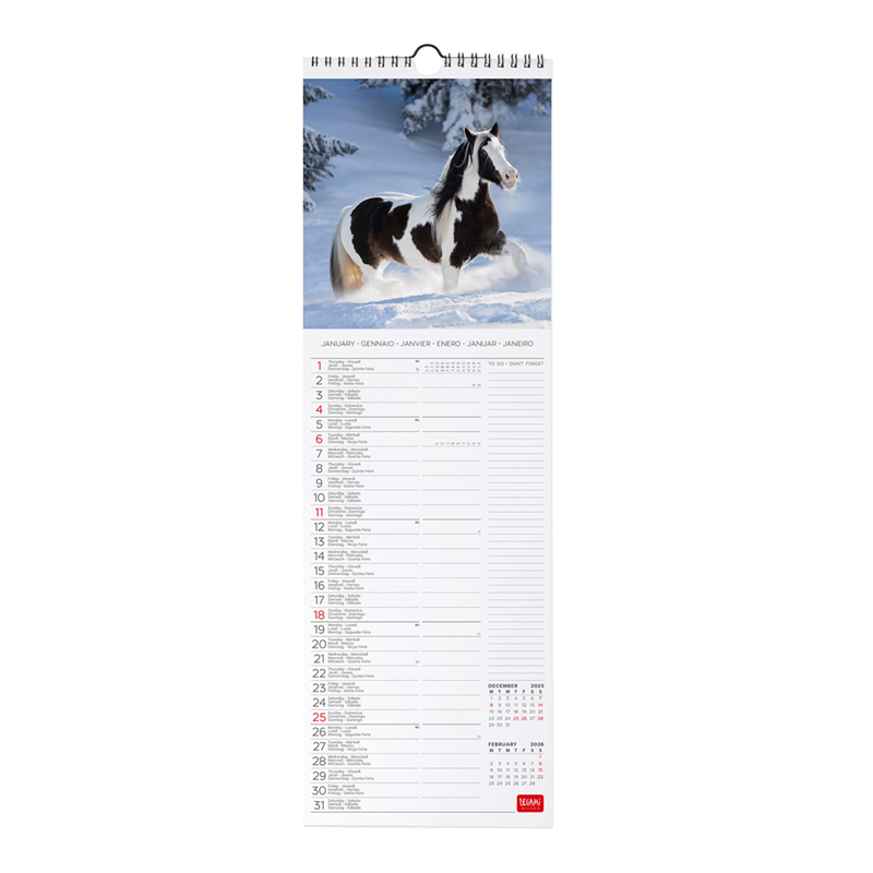 Calendario da parete 16x49 cm per il 2026, caratterizzato da splendide fotografie di cavalli selvaggi. Ogni mese presenta un'immagine unica che cattura la maestosità e la grazia di questi animali in ambienti naturali. Ideale per gli amanti della natura e dei cavalli, aggiunge un tocco di eleganza a qualsiasi spazio. Stampato su carta di alta qualità, con design pratico per segnare appuntamenti e date importanti.