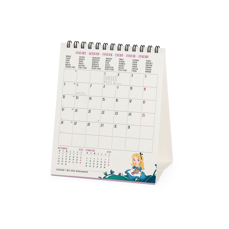 Calendario da Tavolo 12x14,5 cm Special Edition Alice In Wonderland 2026 di Legami: Un viaggio magico nel mondo di Alice con illustrazioni esclusive, perfetto per organizzare le tue giornate con stile e fantasia. Caratterizzato da design artistici ispirati al classico di Lewis Carroll, questo calendario aggiunge un tocco di meraviglia alla tua scrivania, con spazio per annotazioni giornaliere. Un must-have per gli appassionati di Alice e per chi cerca un'organizzazione creativa e ispirata.