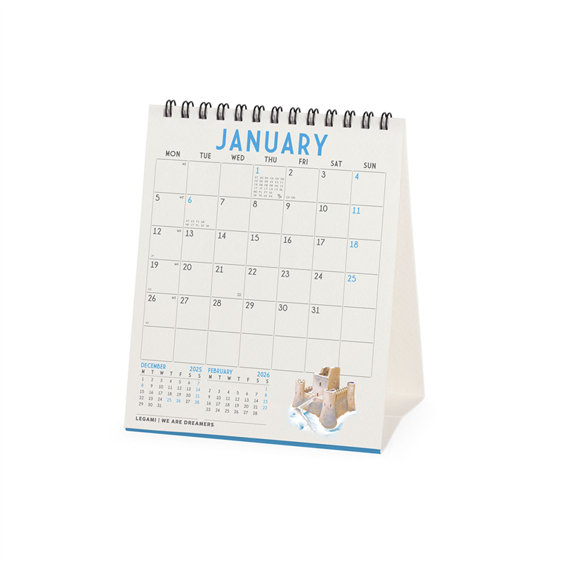 Calendario da tavolo 12x14,5 cm Special Edition Italy 2026 di Legami. Questo elegante calendario presenta immagini mozzafiato delle meraviglie italiane, arricchendo ogni mese con scatti artistici di paesaggi, città storiche e cultura italiana. Perfetto per l'ufficio o la casa, offre spazio per annotazioni, festività e permette di organizzare al meglio le tue attività quotidiane, mantenendo sempre uno sguardo sulle bellezze dell'Italia. Un accessorio funzionale e decorativo per appassionati di viaggi e amanti del design italiano.