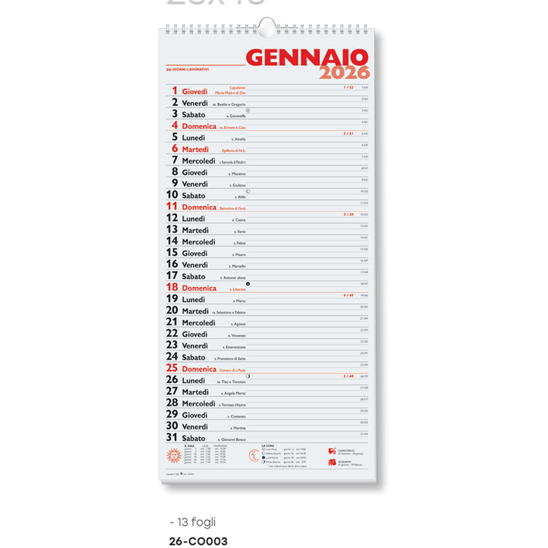 Calendario da parete formato 23x48 cm con spirale, design olandese. Presenta un layout mensile chiaro e intuitivo, con ampio spazio per note e annotazioni giornaliere. Stampato su carta di alta qualità, ideale per organizzare impegni e appuntamenti.