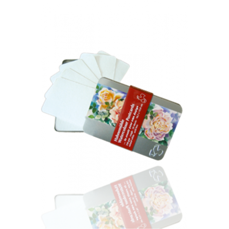 post card per acquarello in box metallo con 30 fogli grammi 250, grana grossa acid free, resistente all'invecchiamento. colore bianco naturale. cm. 10,5x14,8.
