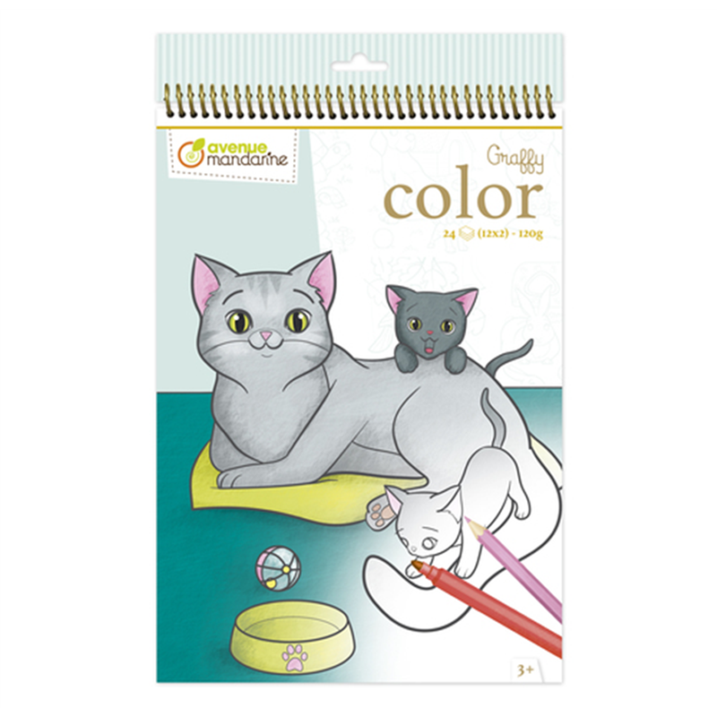 il blocco da colorare contiene 24 fogli, suddivisi in due set da 12 fogli ciascuno, con dimensioni di 21x34,2 cm. presenta illustrazioni di animali domestici raffigurati in coppie di mamma e figlio. il prodotto è realizzato da avenue mandarine ed è progettato per stimolare la creatività e l'apprendimento dei bambini attraverso il disegno e la colorazione.