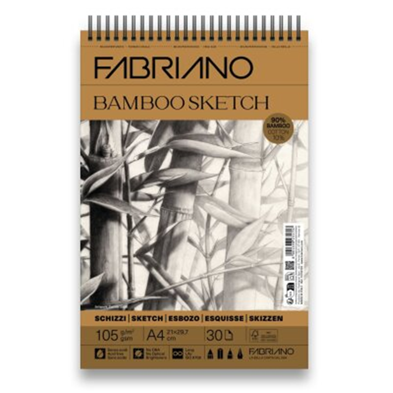 fabriano bamboo è una carta di alta qualitàcomposta per il 90% da fibre di bambù e per il 10% dacotone. il bambù è una materia prima efficiente:cresce molto rapidamente e si rigenera senzabisogno di essere ripiantato. è anche una fibraannuale: con la stessa superficie di terreno generapiù cellulosa rispetto alle specie arboree tradizionali.• la carta è certificate fsc® mix e acid-free• è disponibile in 105gsm per schizzi e disegno, e in280gsm per varie tecniche di pittura e tecniche miste.• le fibre di bambù offrono una resistenza eccezionaleche, insieme alla collatura interna ed esterna,rendono la carta estremamente resistente e adattaanche per le tecniche umide. la carta supportanumerose applicazioni con vari strumenti senzadanneggiarsi• ha un colore bianco caldo e naturale poiché noncontiene agenti sbiancanti ottici (oba).• la superficie ha una grana naturale che consente unlavoro dettagliato e preciso, valorizzando i segniespressivi e abbozzati delle tecniche di disegno a secco