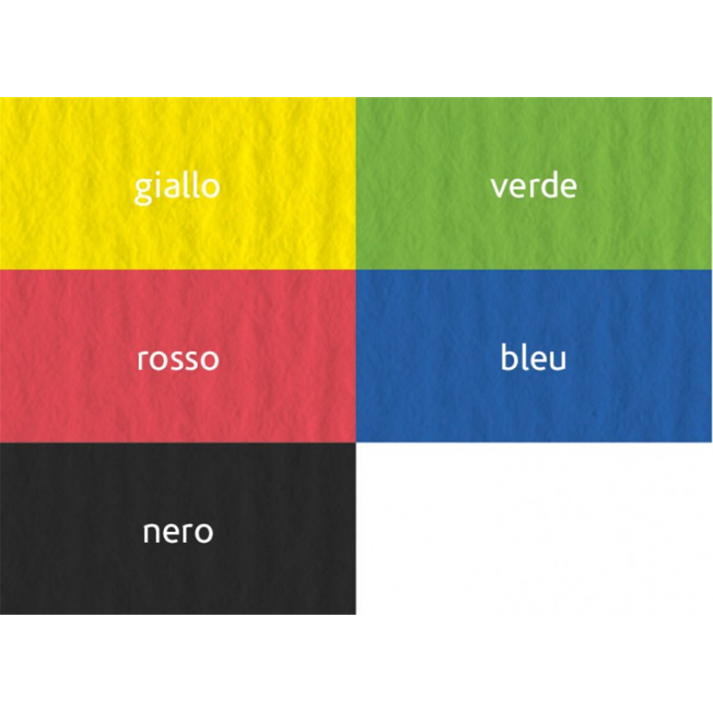 le superfici, liscia da un lato e ruvida dall'altro, rendono questo prodotto particolarmente stimolante per ogni applicazione crativa. la vivacità e il facile accostamento dei colori fanno di questo prodotto uno splendido veicolo di comunicazione grafica. la carta è prodotta con il 100% di cellulosa e.c.f. (elemental chlorine free), certificata f.s.c. (©1996 forest stewardship council a.c.) proveniente da foreste gestite secondo rigorosi standard ambientali, sociali ed economici. colori: giallo, rosso, verde, bleu, nero.