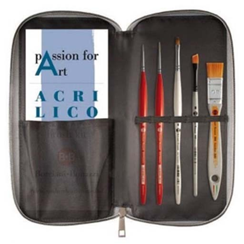 astuccio con zip in tessuto lavabile con pattern storia bb. all’interno tasca porta tutto ed elastici. contiene una selezione di pennelli in filato sintetico divisa per tecnica pittorica.
