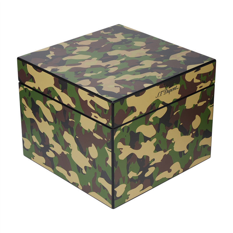 humidor cubico decorato con motivo mimetico. contiene un vassoio rimovibile e un igrometro. capacità di 60 sigari corona. rivestimento in legno di cedro. boveda ref kit 087377