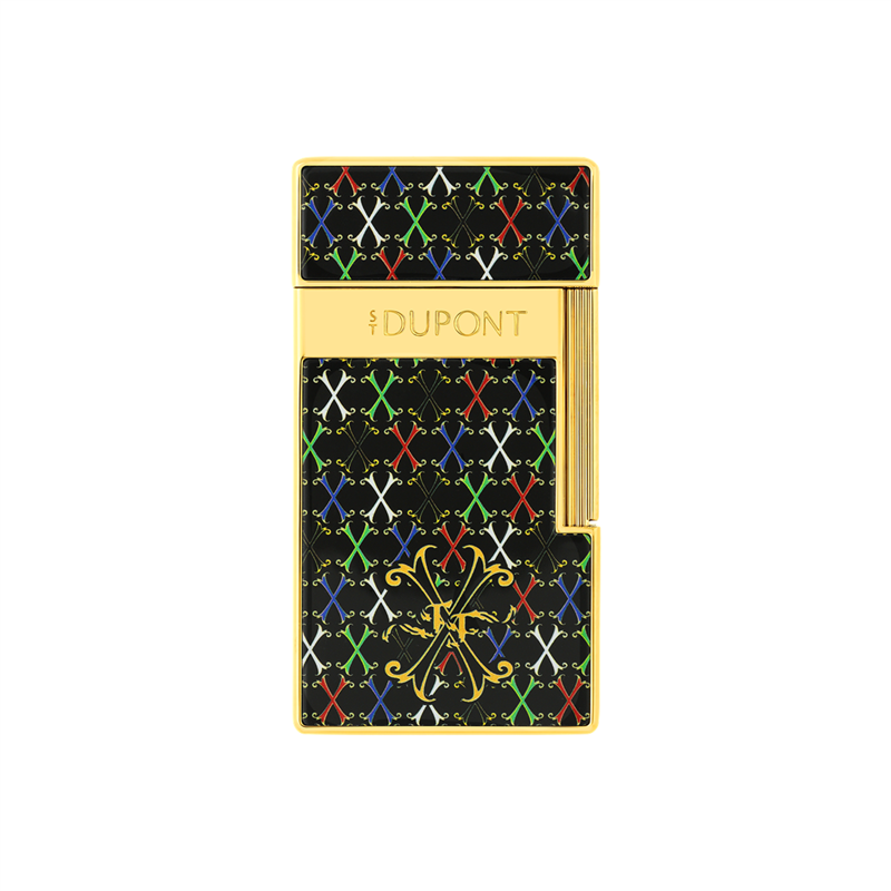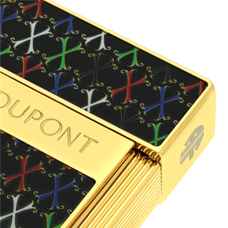 Accendino di lusso con finitura nera e dettagli dorati, parte della collezione S.T. Dupont, noto per l'eleganza e l'artigianalità.