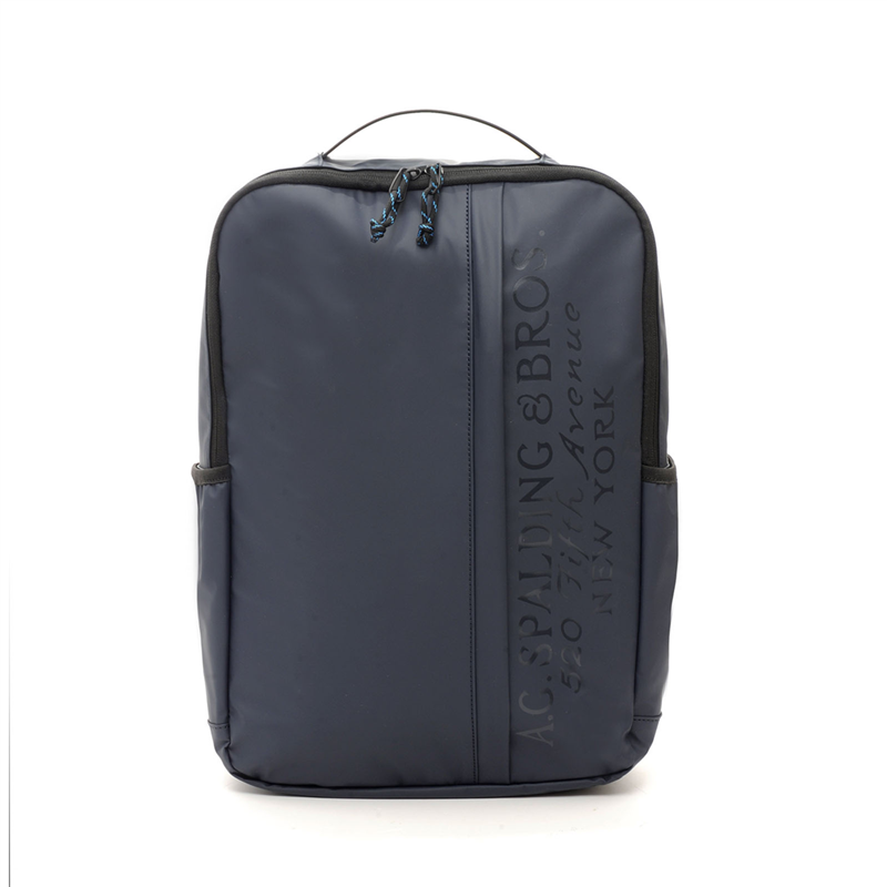 materiale: nylon gommato. all'esterno in verticale logo a.g.spalding&bros. lucido su nylon opaco. grande tasca esterna verticale. spazio centrale con all'interno tasca per pc fino a 15/6" con altra tasca. sul retro tasca imbottita per pc fini a 15/6". due tasche laterali per bottiglie od altro. retro imbottito con tessuto traspirante con fascia per trolley. spallacci imbottiti ed ergonomici.