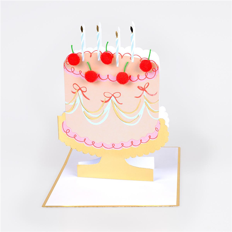 Biglietto di auguri decorato con una torta di ciliegie, ornato con dettagli luccicanti e una festosa ghirlanda, perfetto per celebrare occasioni speciali con un tocco di allegria e originalità.