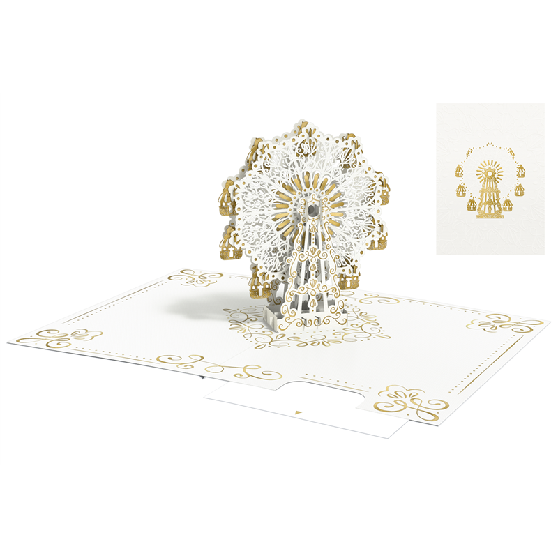 Biglietto Popup Kirigami Handmade con ruota panoramica in oro, realizzato artigianalmente da Origamo. Questo elegante biglietto presenta un design tridimensionale intricato che si apre per rivelare una sorprendente ruota panoramica dorata, perfetto per occasioni speciali e per sorprendere con un tocco artistico e raffinato.