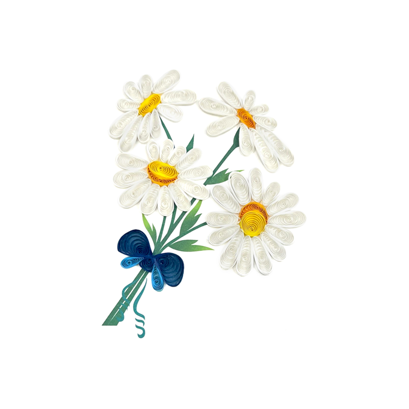 Biglietto d'auguri realizzato a mano con la tecnica del quilling, raffigurante delicate margherite su uno sfondo elegante. Un'opera d'arte unica firmata Origamo, perfetta per celebrare occasioni speciali con un tocco di creatività e raffinatezza.