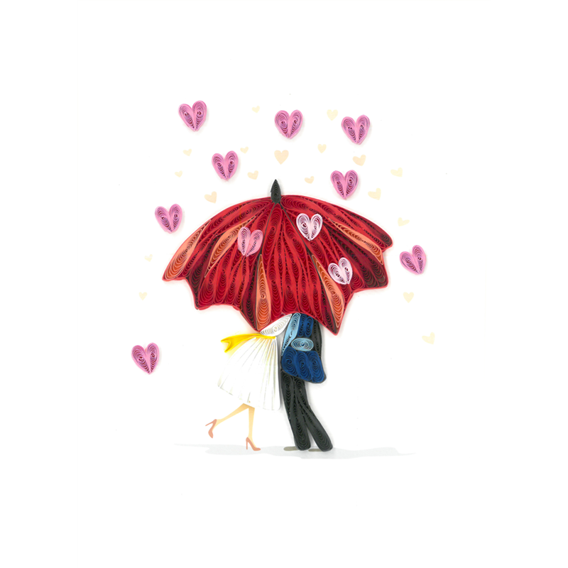 Biglietto d'auguri fatto a mano con la tecnica del quilling, presenta un design di cuori che piovono dall'alto, simbolo di amore e affetto. Perfetto per esprimere emozioni profonde in occasioni speciali.
