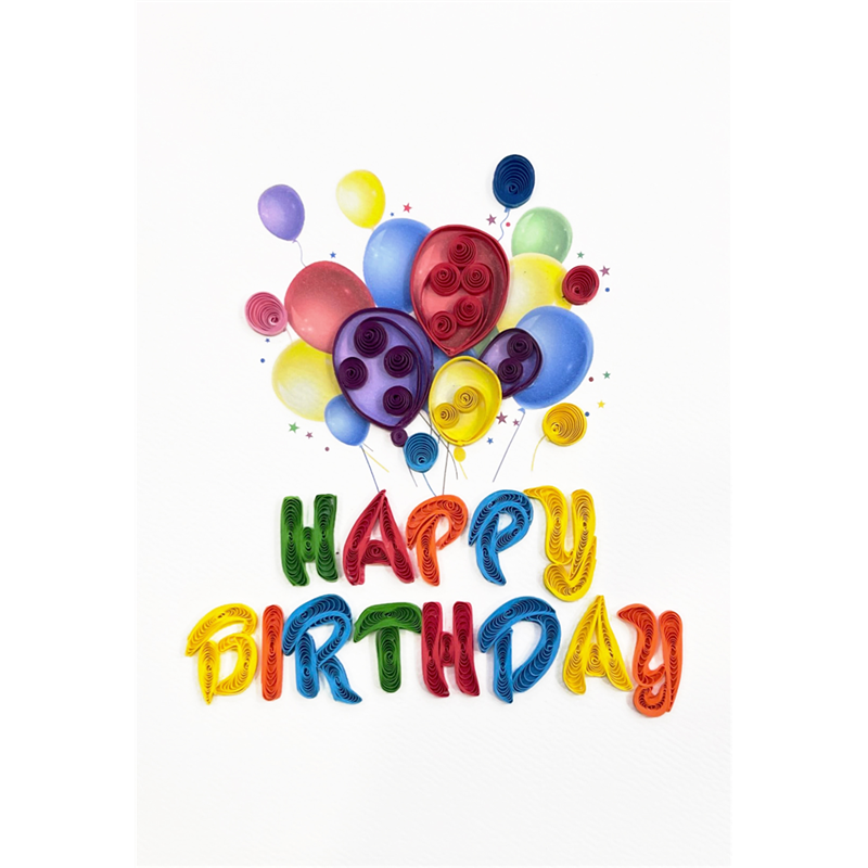 Biglietto di auguri artigianale realizzato con la tecnica del quilling, caratterizzato da un design vivace di palloncini colorati. Perfetto per celebrare compleanni e occasioni speciali, questo biglietto unisce l'eleganza e la creatività del lavoro fatto a mano, aggiungendo un tocco personale e unico ai tuoi auguri.