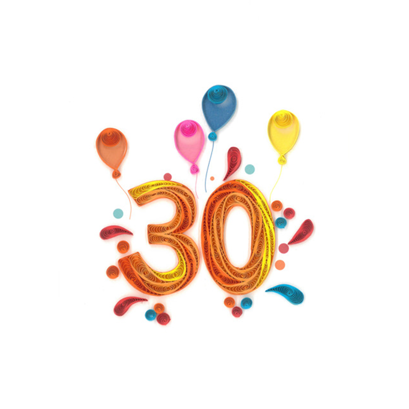 "Augura un felice 30° compleanno con un tocco di eleganza! Questo biglietto d'auguri in quilling fatto a mano presenta un design dettagliato e raffinato, perfetto per celebrare un traguardo così speciale. Ogni dettaglio è stato realizzato con cura e maestria, rendendo questo biglietto un ricordo prezioso per chi lo riceve. Con Origamo, trasformi i tuoi auguri in un'opera d'arte unica."